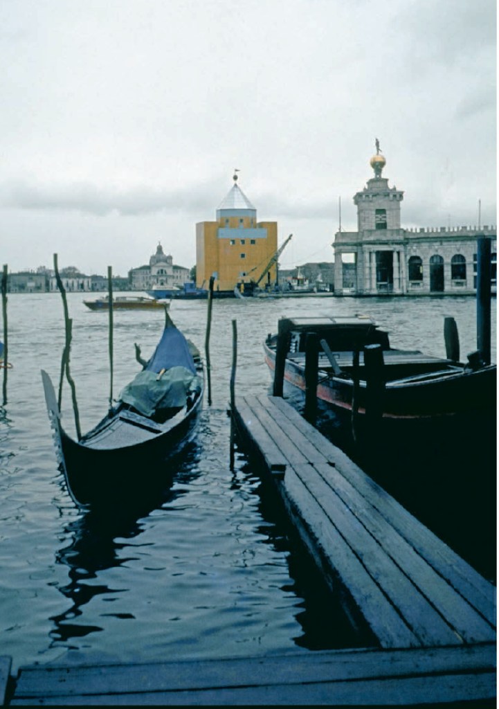 Aldo Rossi’s Teatro del Mondo (Theater of the World) anchored at the Punta della Dogana during the 1980 Venice Architecture Biennale from Exhibit A Exhibitions That Transformed Architecture 1948-2000
