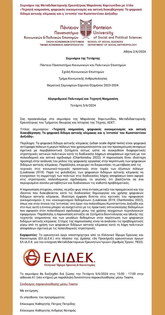 5 June 2024 Ι was invited to deliver a seminar “Artificial intelligence, digital universalism and urban governance: The digital twins of urban scale and the ‘entopia’ of Konstantinos Doxiadis” at the Department of Social Anthropology of Panteion University of Social and Political Sciences