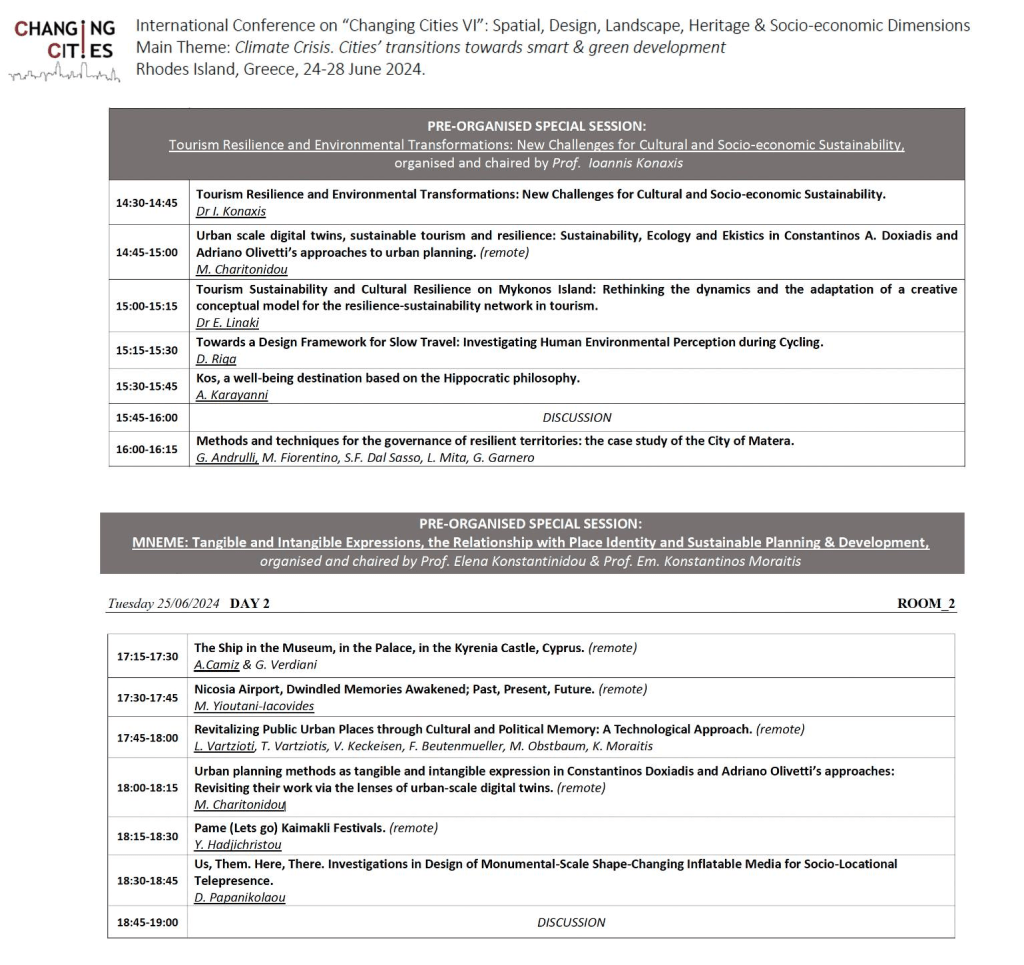 25 June 2024 Marianna Charitonidou, “Urban Scale Digital Twins, Sustainable Tourism and Resilience: Sustainability, Ecology and Ekistics in Constantinos A. Doxiadis and Adriano Olivetti’s Approaches to Urban Planning”, 6th International Conference on “Changing Cities” Spatial, Design, Landscape, Heritage and Socio-Economic dimensions, Rhodes Island, Greece. This paper was part of the special session “Tourism Resilience and Environmental Transformations: New Challenges for Cultural and Socio-economic Sustainability”.