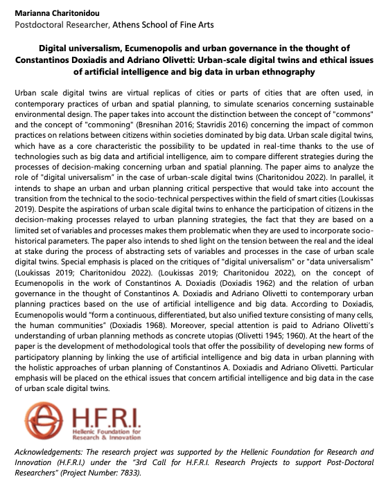 24-26 May 2024 My paper entitled “Digital universalism, Ecumenopolis and urban governance in the thought of Constantinos Doxiadis and Adriano Olivetti: Urban-scale digital twins and ethical issues of artificial intelligence and big data in urban ethnography” was presented at the 2nd Conference of the Association of Social Anthropologists Greece (SKAE)