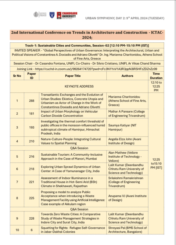 9 April 2024 Marianna Charitonidou , “Transatlantic Exchanges and the Evolution of Urban Studies: Ekistics, Concrete Utopia and Urbanism as Actor of Change in the Work of Constantinos Doxiadis and Adriano Olivetti”, 2nd International Conference on Trends in Architecture and Construction (ICTAC 2024), University of Chandigarh, University of Florence, University Xi’an Jiaotong-Liverpool