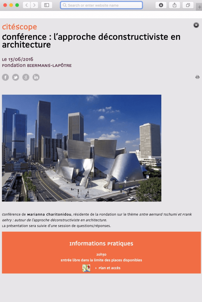 13 June 2016 Marianna Charitonidou, “Entre Bernard Tschumi et Frank Gehry: autour de l’approche déconstructiviste en architecture”, Presentation at the Fondation Biermans-Lapôtre – Cité Internationale Universitaire de Paris, Paris, France