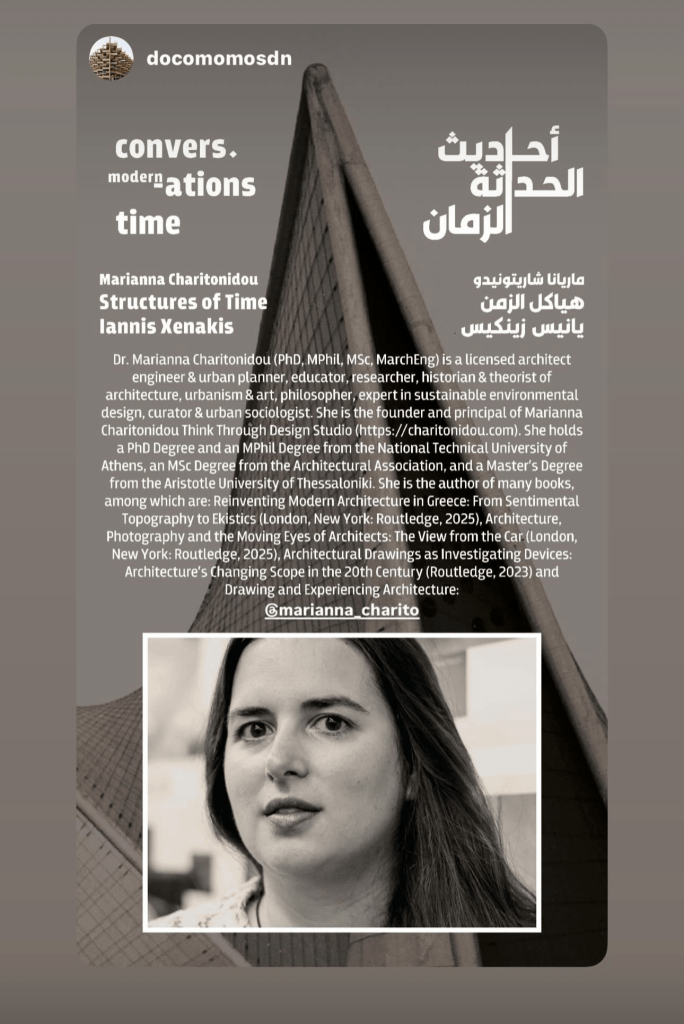 24 January 2026 I was invited to give a talk entitled “Structures of Time: Iannis Xenakis between Music and Architecture” in the framework of the Third Conference of Modern Conversations organised by the Modern Sudan Collective/The Sudan Chapter of Docomomo (the International Committee for Documentation and Conservation of Buildings, Sites and Neighbourhoods of the Modern Movement)